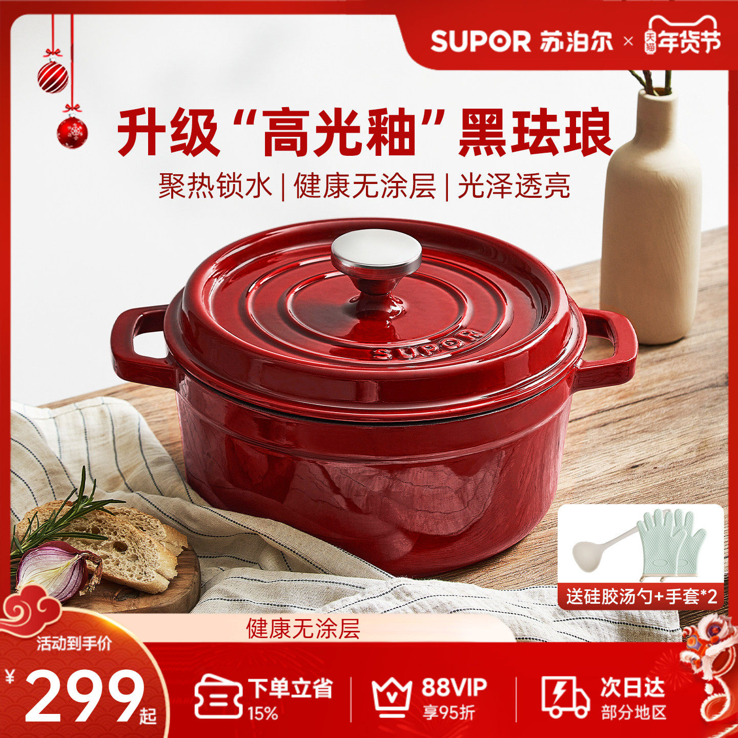 苏泊尔珐琅锅铸铁锅家用炖锅砂锅煲汤锅焖锅煮锅汤锅砂锅红色燃气