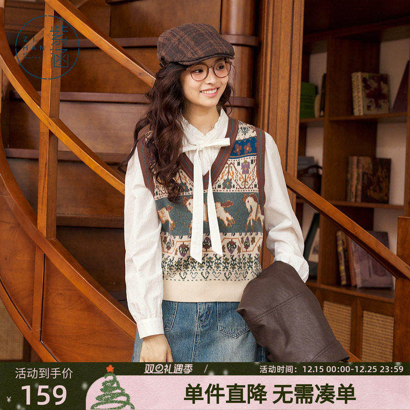 紫涵V领无袖针织马甲背心女秋季新款复古学院风休闲叠穿毛衣马夹