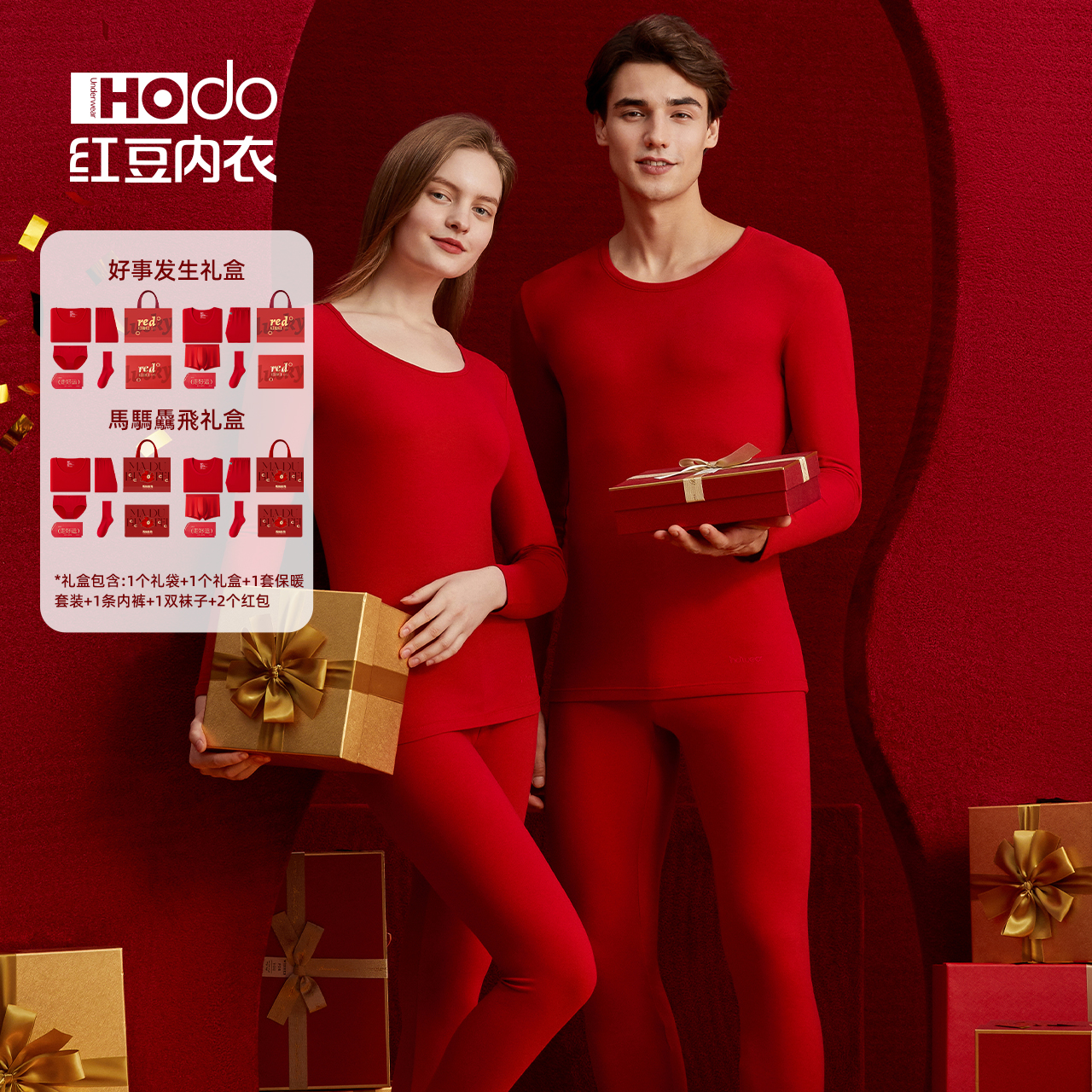 红豆情侣红色保暖内衣套装马本命年男女结婚秋衣秋裤内裤袜子礼盒