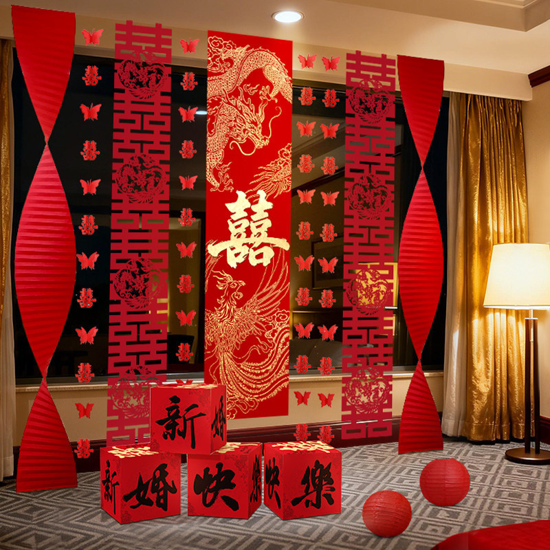 婚房布置套装窗帘装饰结婚长条喜字婚礼男方女方卧室蝴蝶挂饰条幅