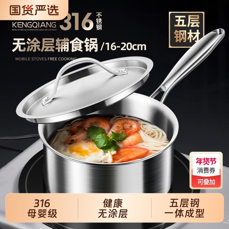 无涂层316L不锈钢小奶锅宝宝辅食锅煮粥不粘锅加厚汤锅一体煮煎炒