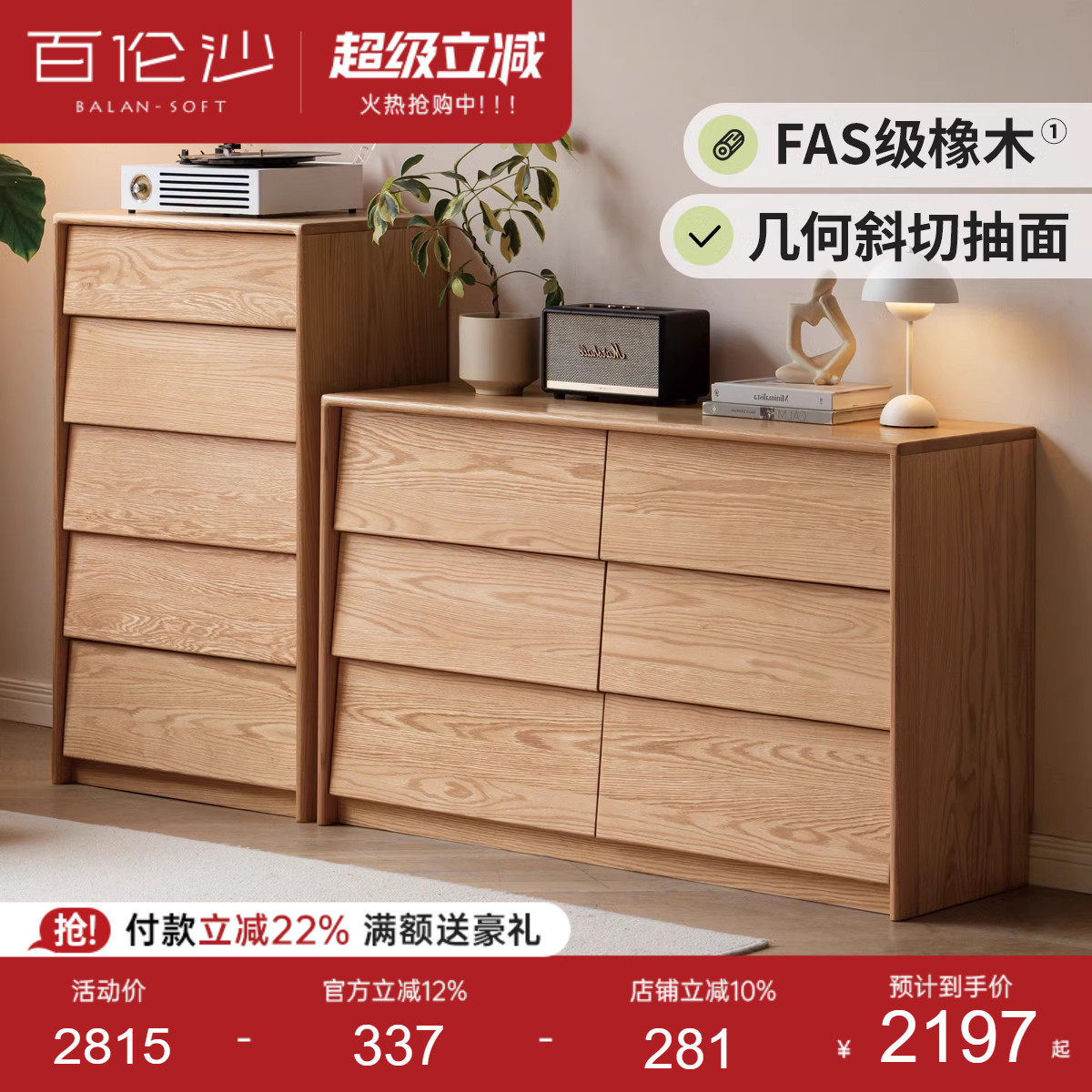 源氏木语百伦沙实木斗柜卧室五斗柜六斗柜橡木储物收纳柜原木斗橱