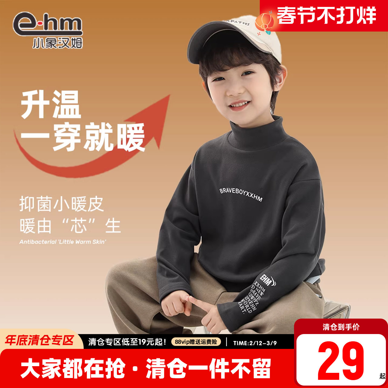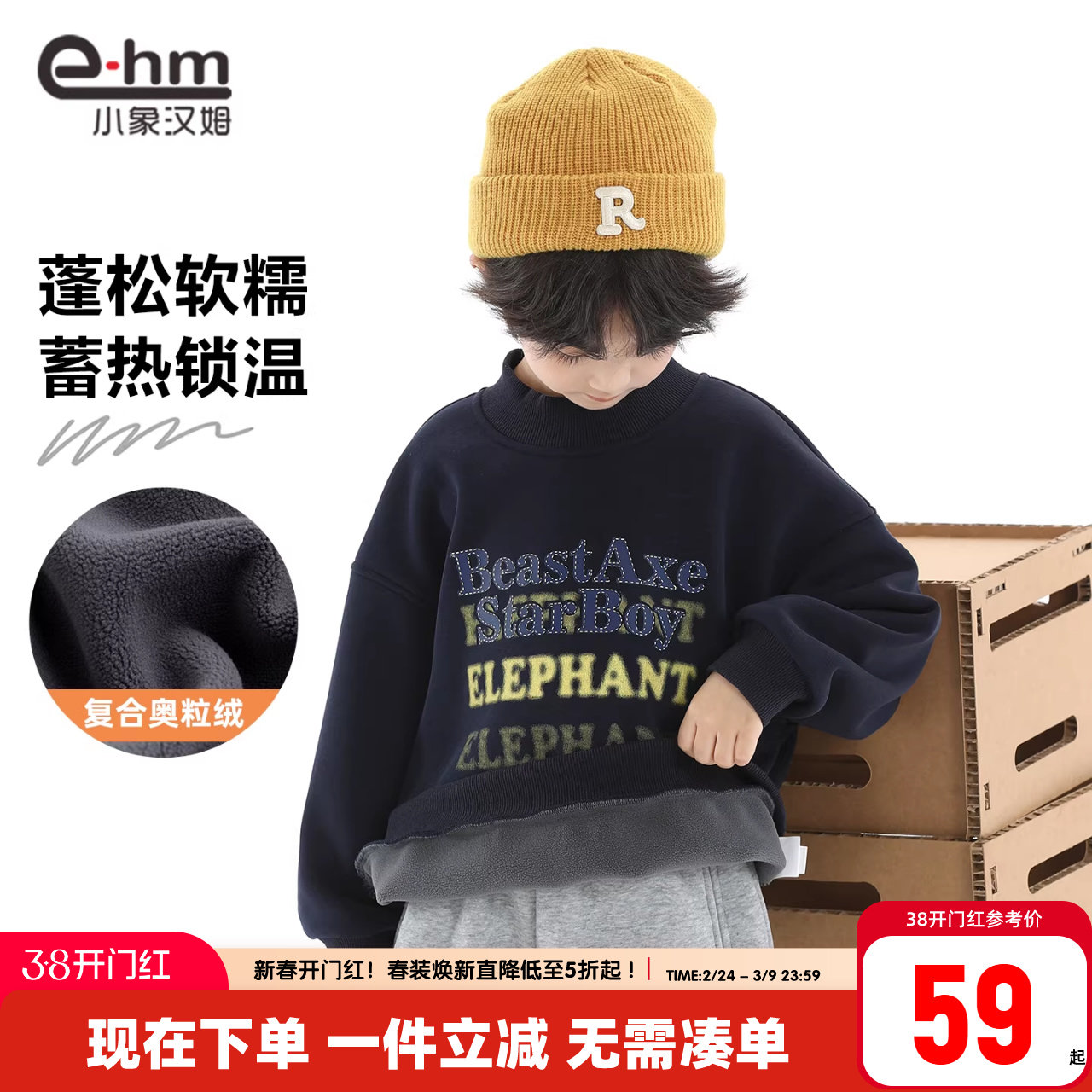 小象汉姆童装男童加绒卫衣保暖冬装新款2026儿童打底衫半高领洋气