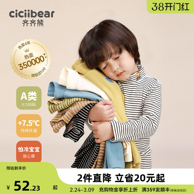 [发热]齐齐熊男童打底衫冬款宝宝条纹儿童半高领T恤童装女童纯色