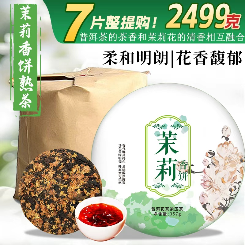 茉莉花茶普洱茶熟茶茶饼七子饼茶古树茶叶口粮叶熟普茶饼茉莉普洱