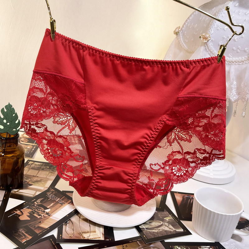 本命年红内裤女士中腰无痕蕾丝性感纯棉裆冰丝透气大码胖mm三角裤