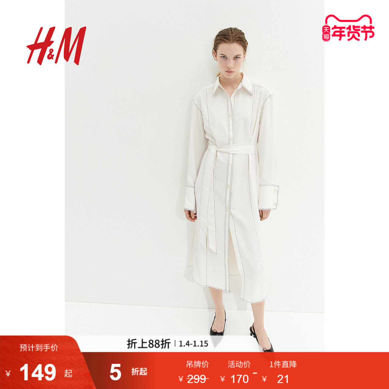 HM女士连衣裙冬季潮流中长腰部系带衬衫式连衣裙1207692