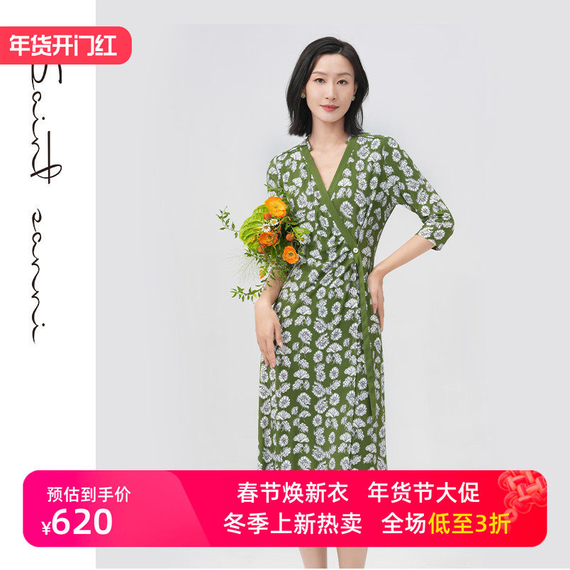 2023新款时尚印花真丝丝绒女士连衣裙气质妈妈翻领秋季桑蚕丝裙子