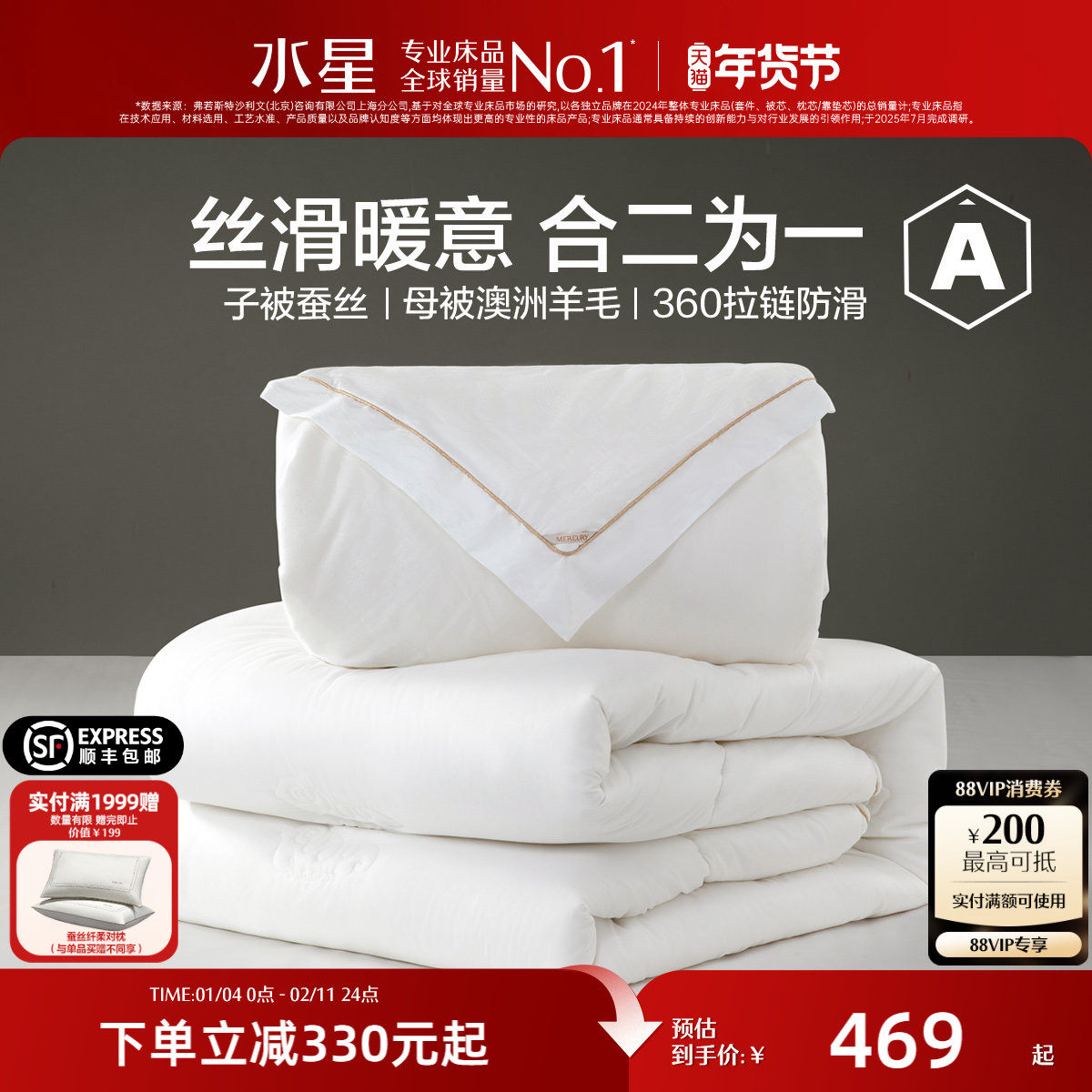 水星家纺抑菌蚕丝澳洲羊毛二合一被单双人子母被子被芯26年新品