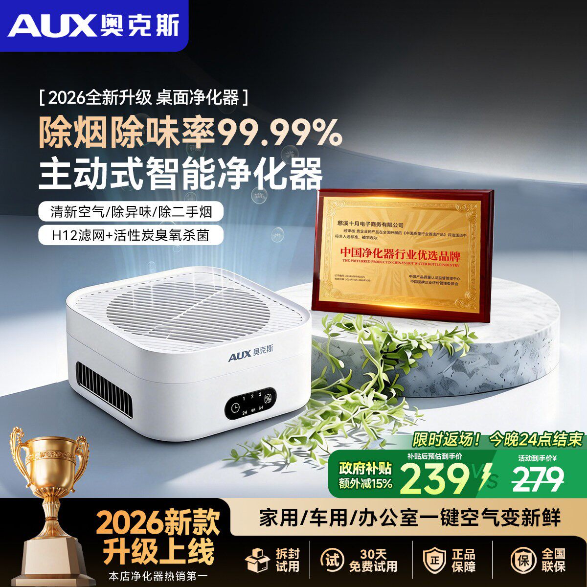 奥克斯空气净化器家用除二手烟味异味除甲醛桌面小型净化机办公室