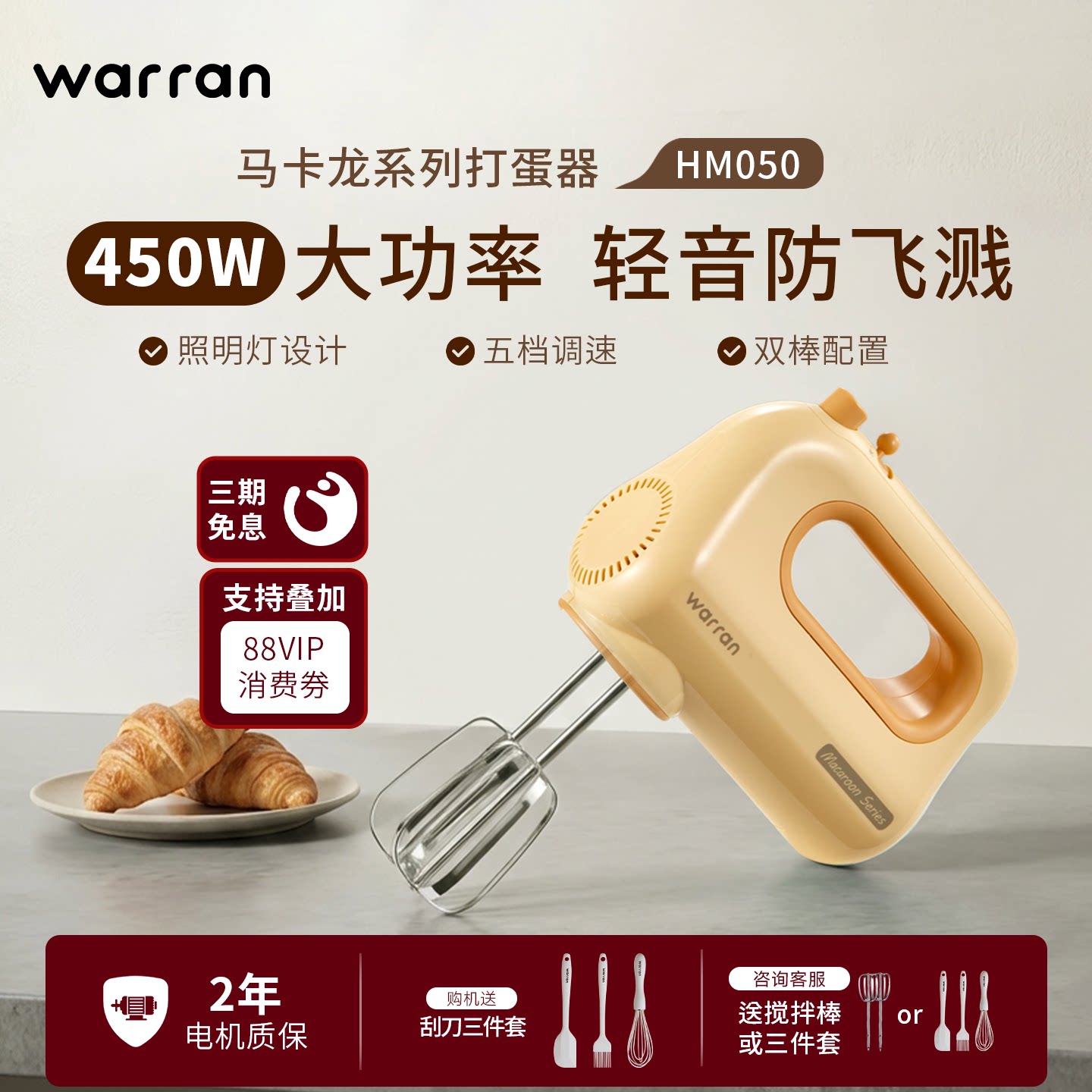 华伦打蛋器电动家用450W大功率轻音烘焙蛋糕专用搅拌机奶油打发器