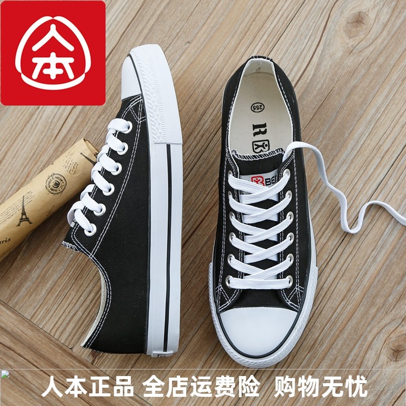 人本帆布鞋女学生韩版百搭平底板鞋官方旗舰店官网黑色休闲鞋子女