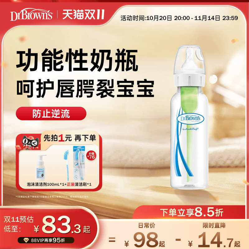 布朗博士PP标准奶瓶唇腭裂专用兔唇宝宝喂养防胀气玻璃250ml