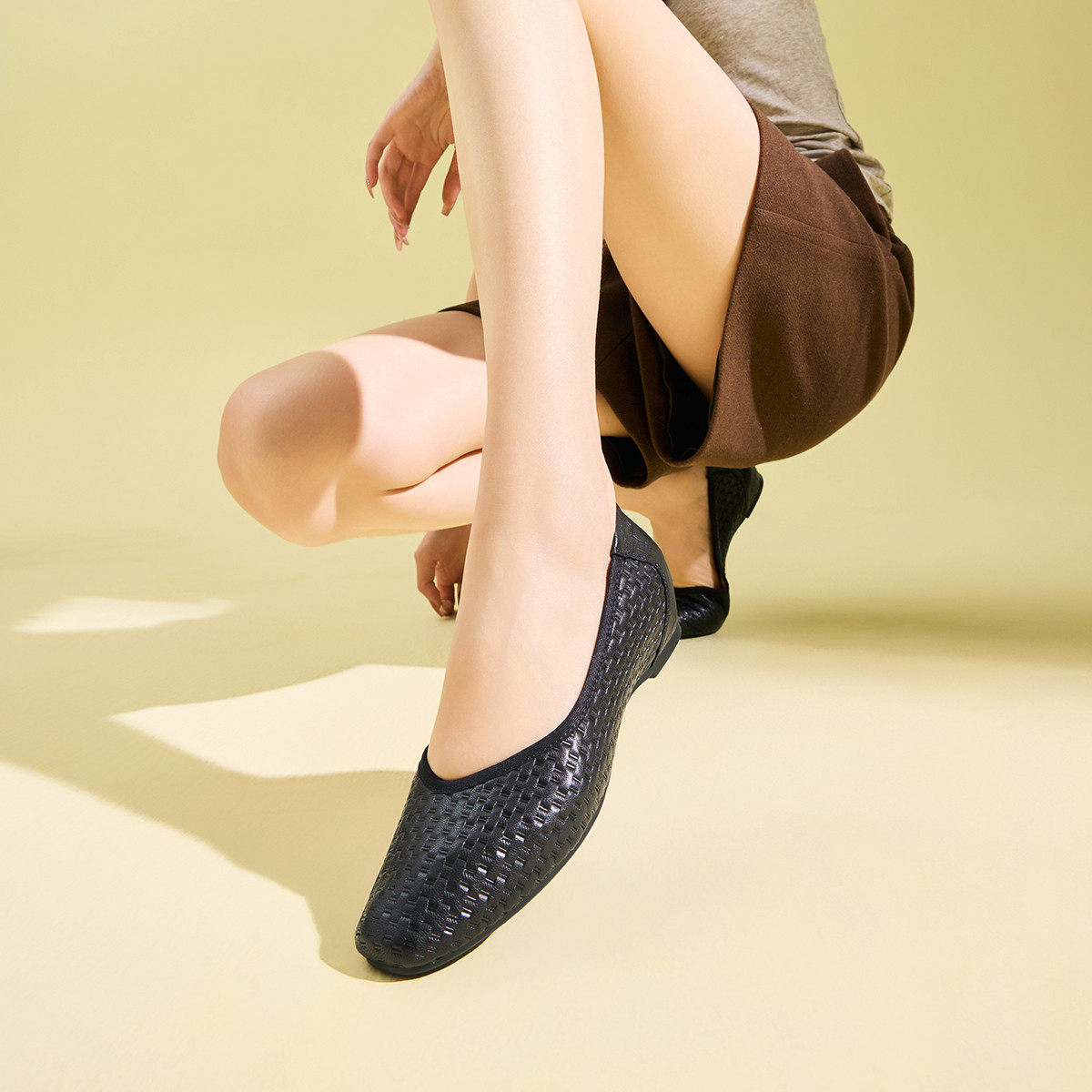 fed羊皮女鞋2025秋季编织纹真皮浅口平底单鞋女芭蕾豆豆妈妈鞋女