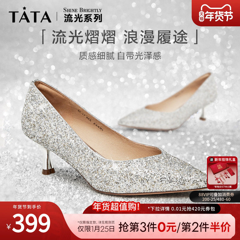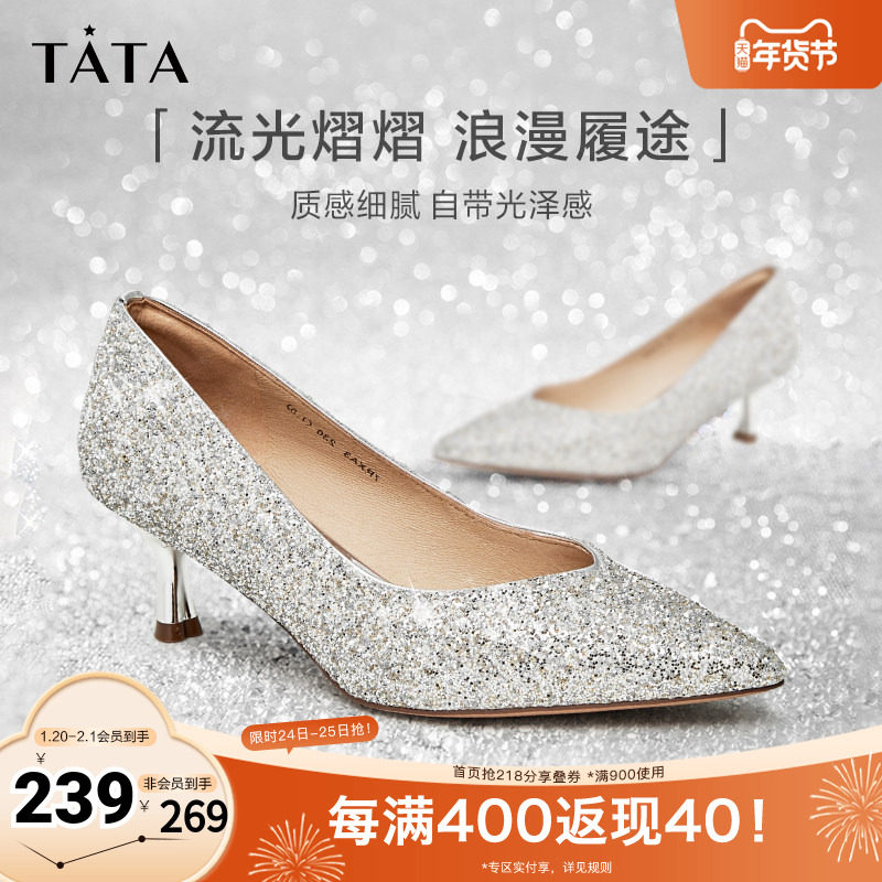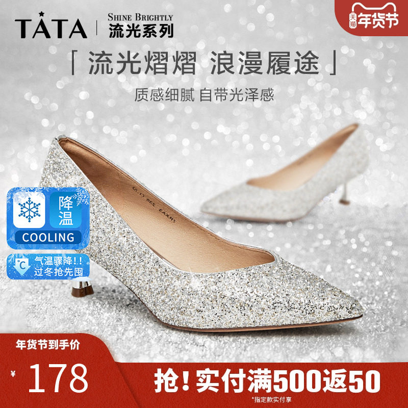 Tata他她银色高跟鞋女奥莱细跟百搭不累脚婚鞋女鞋新款7RXA3CQ3