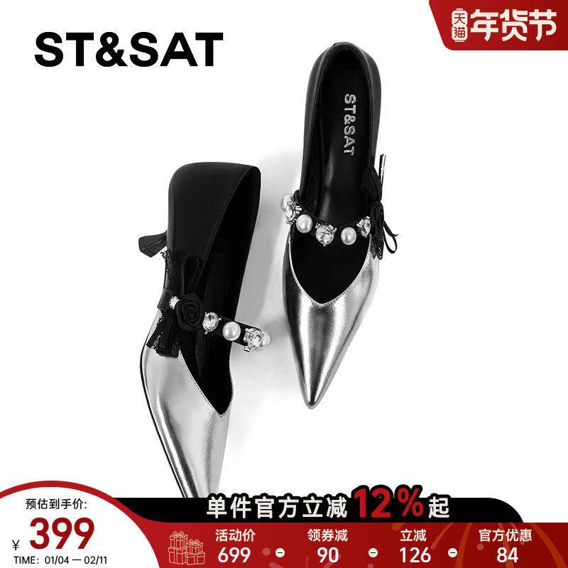 星期六银色高跟鞋女2025尖头细跟珍珠水钻单鞋蝴蝶结法式玛丽珍鞋