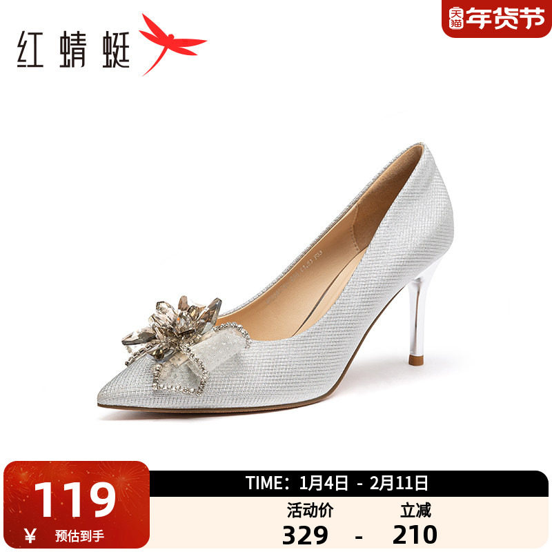 水晶蝴蝶结高跟鞋女绝美亮片细跟婚纱主婚鞋新娘鞋宴会伴娘鞋银色