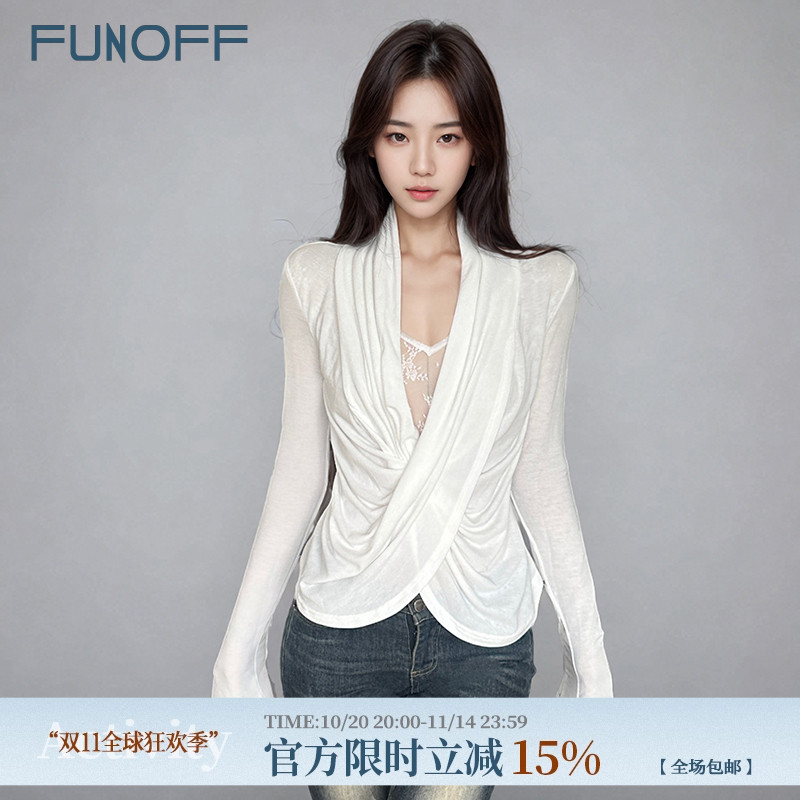 FUNOFF 纯欲风白色蕾丝拼接荡领长袖T恤性感网纱交叉收腰低胸上衣