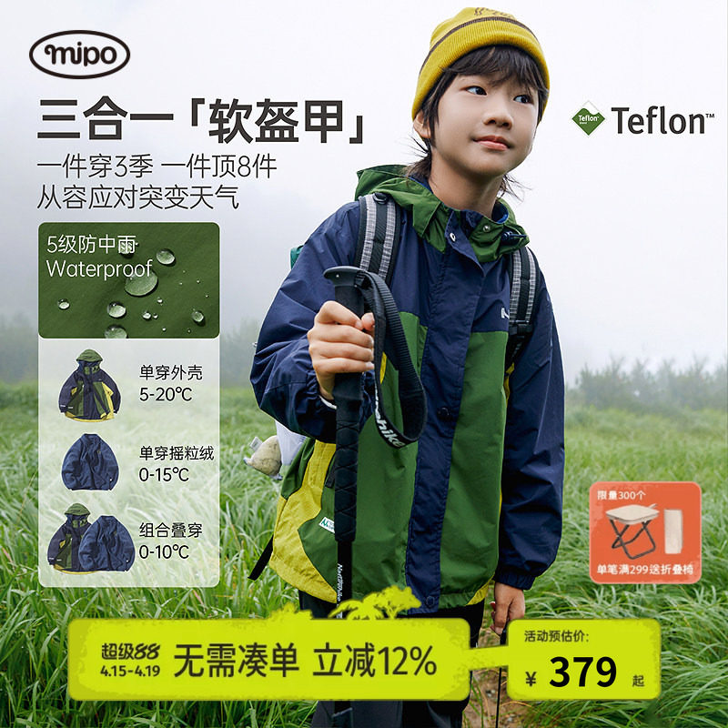 mipo春季儿童冲锋外套女男童三合一防风防水摇粒绒内胆户外运动潮