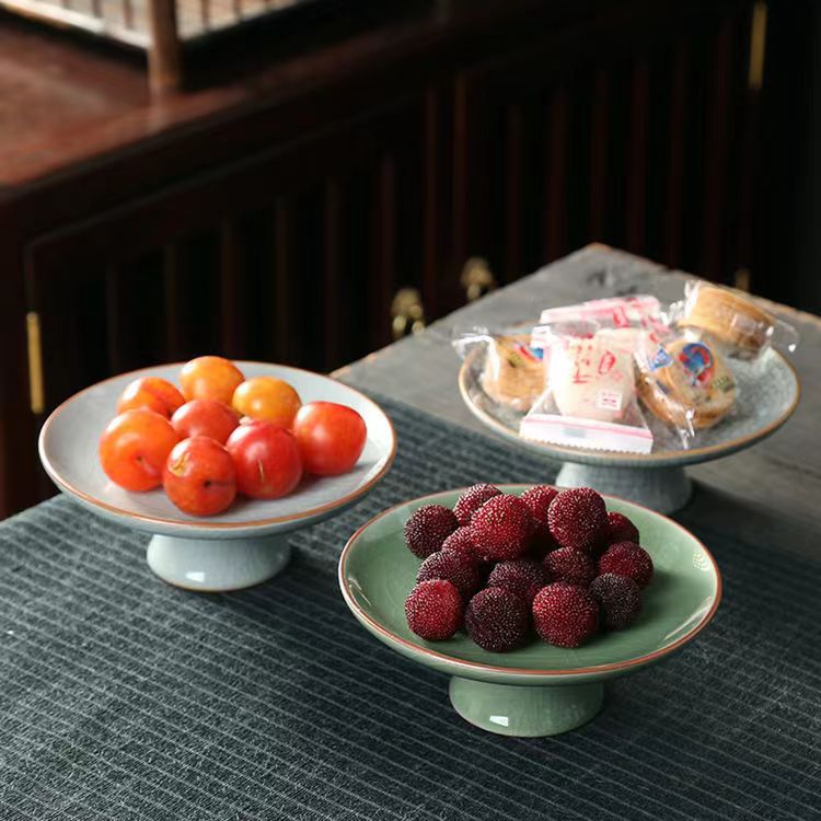 陶瓷哥窑中式水果盘高足茶点盘复古禅意小托盘汝窑家用佛手柑托盘