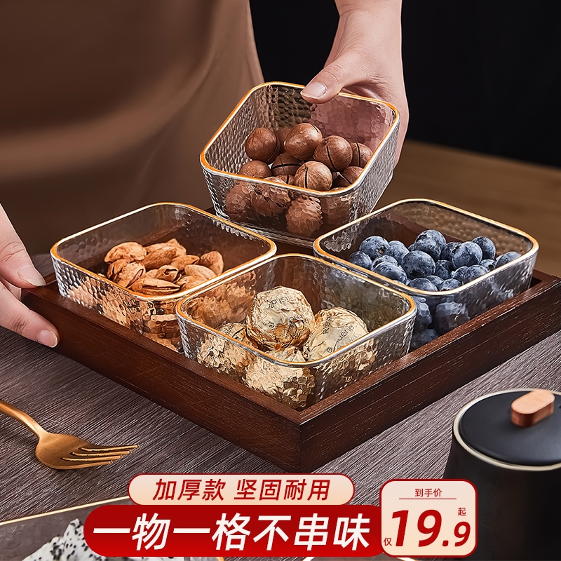 新中式水果盘家用客厅零食盘高档胡桃木玻璃分格干果盘糖果茶点盘