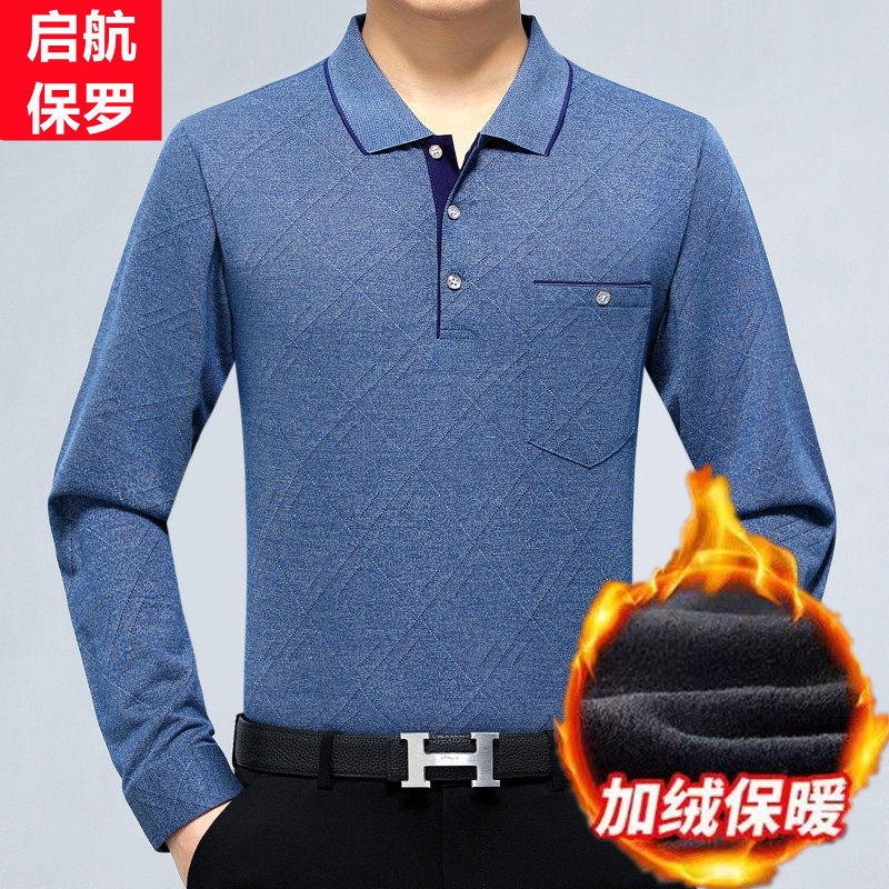 冬季爸爸装男士加绒加厚棉质长袖T恤翻领POLO衫有口袋中老年体恤