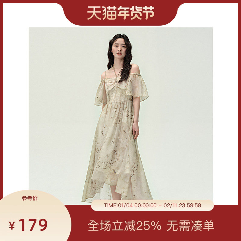 PIT一字领露肩收腰A字碎花短袖连衣裙女2025夏荷叶边吊带中长裙