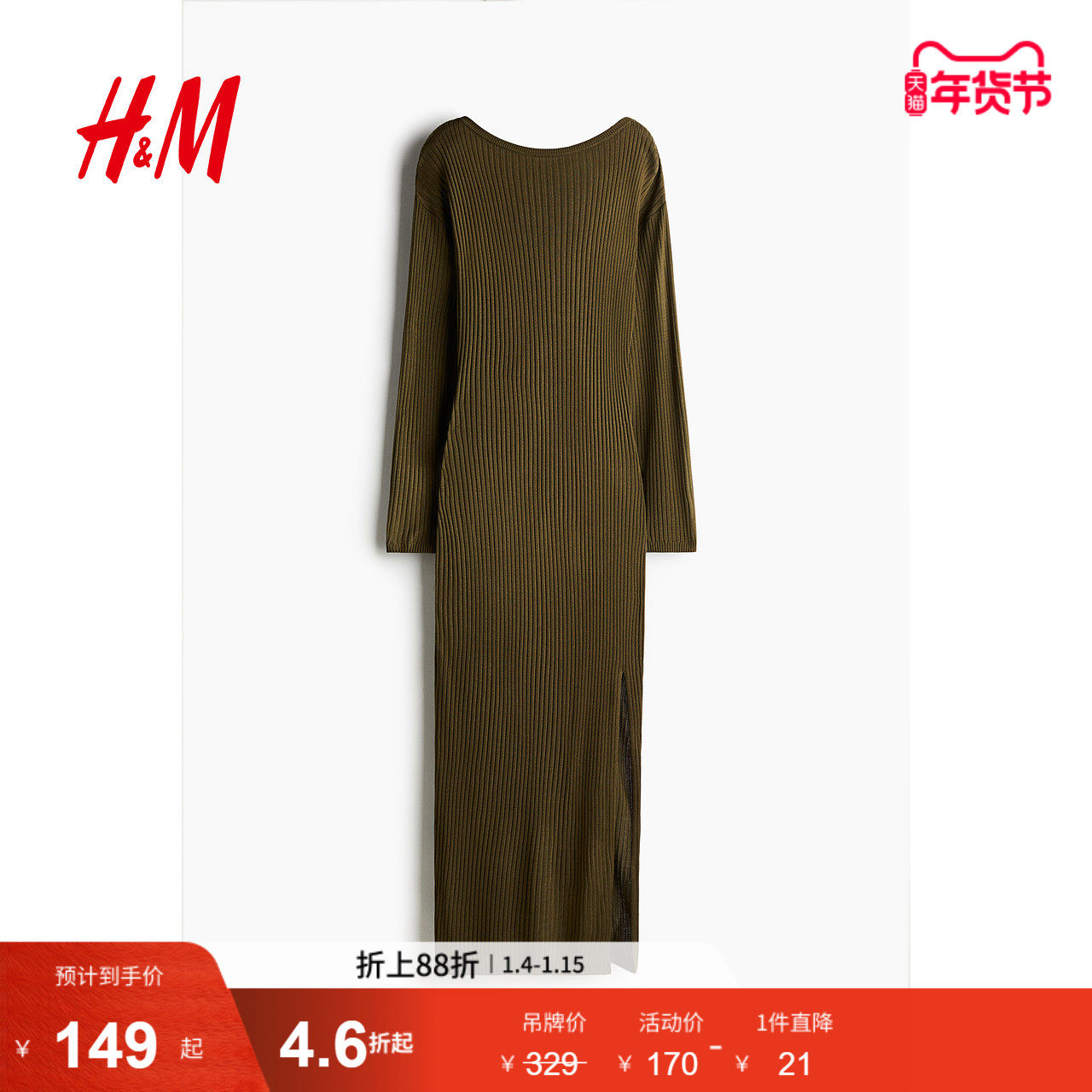 HM女装连衣裙冬季时尚收腰长袖圆领优雅针织长裙1249555