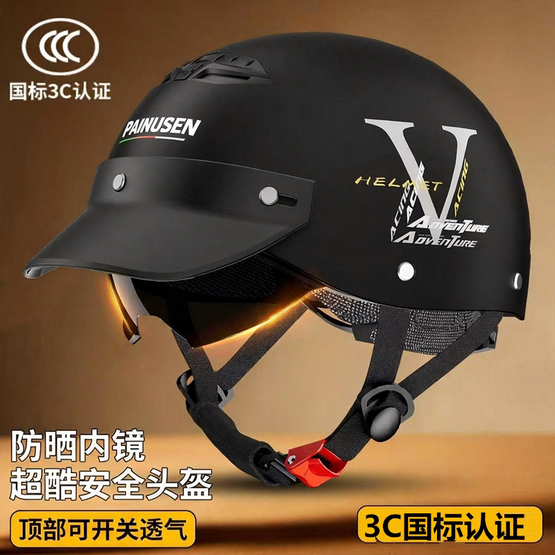 3C认证电动摩托车头盔男女半盔四季通用防晒内镜超酷安全头盔帽子