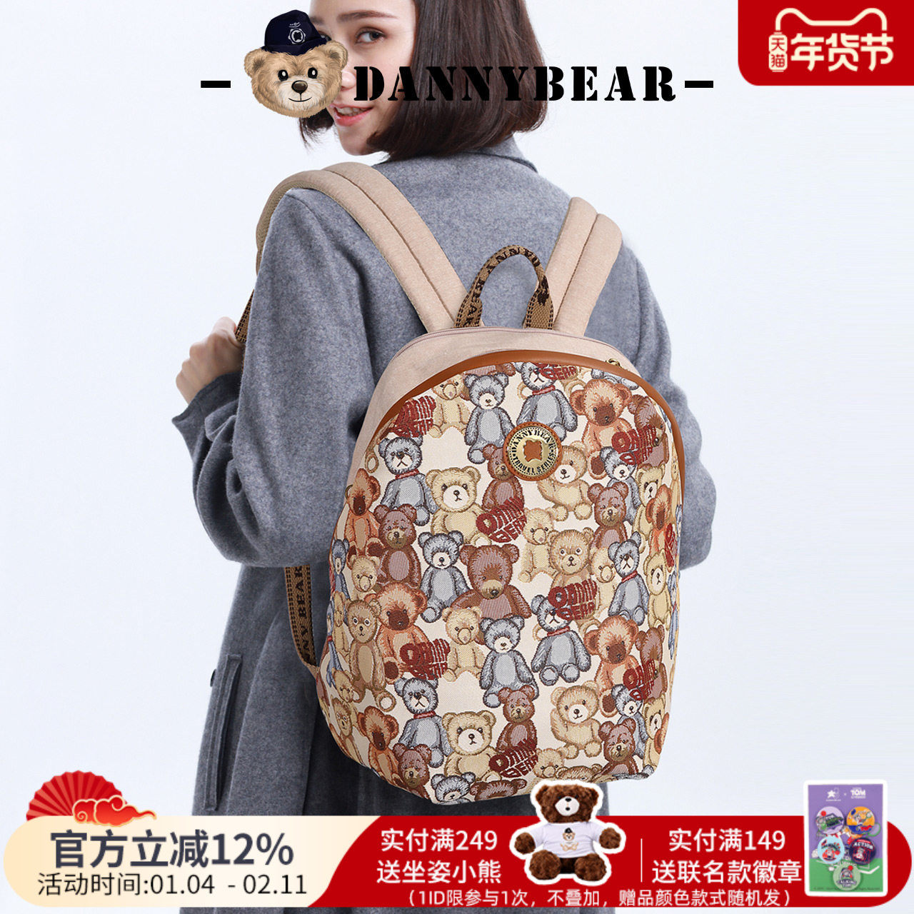 丹尼熊甲壳虫背包双肩包女学生书包扩容旅行提花布背包4825016