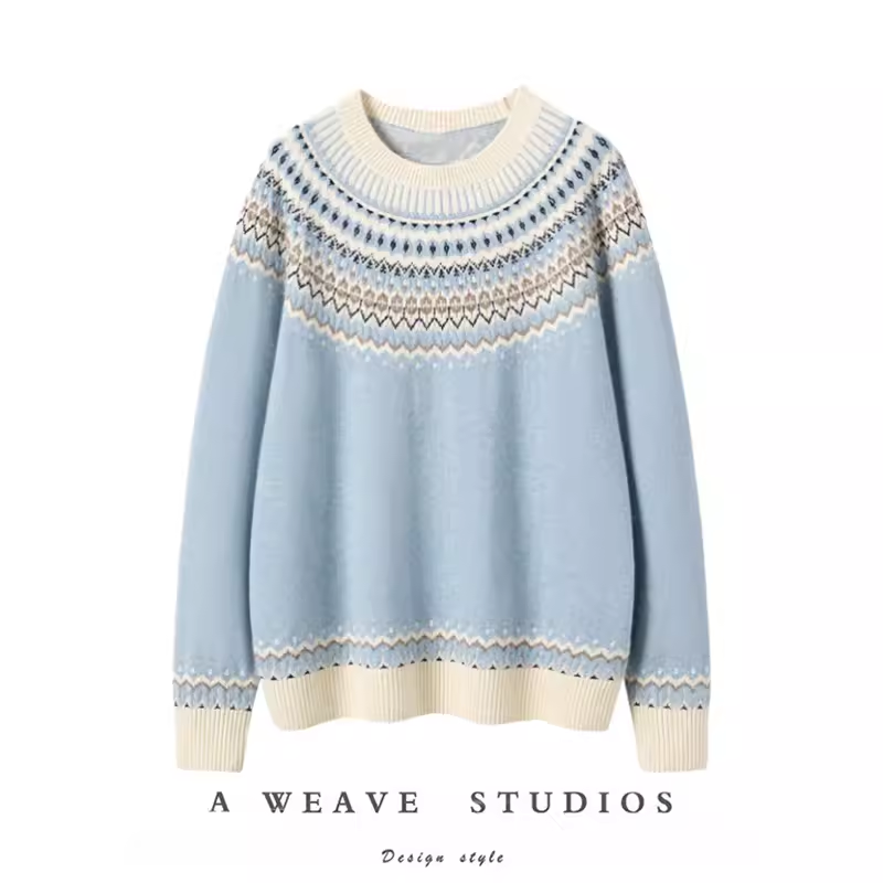 惊艳于人海中~25秋冬费尔岛文艺复古纯羊绒圆领提花针织毛衣女