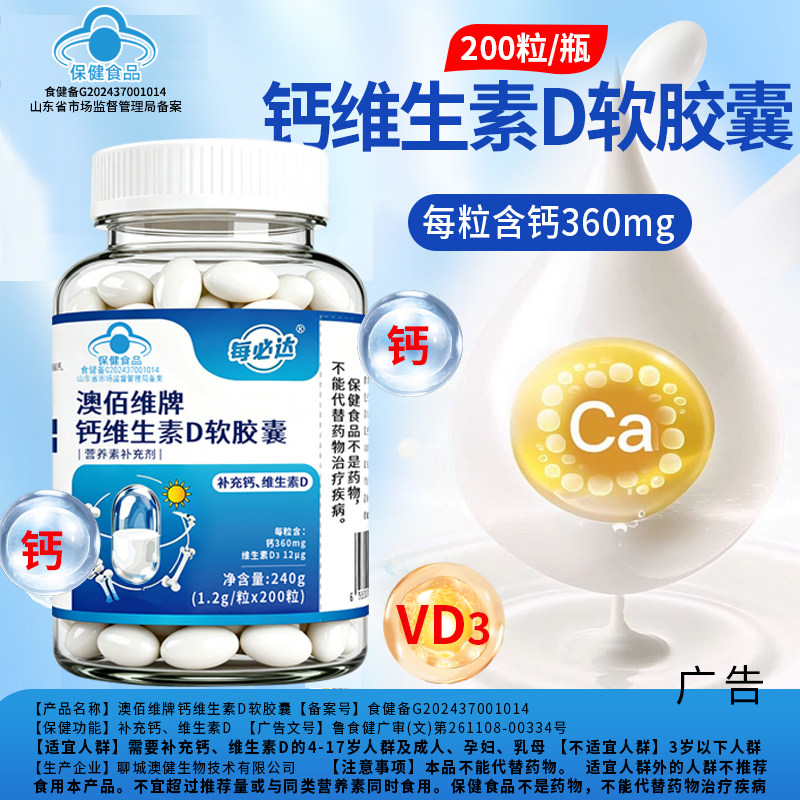 液体钙维生素D软胶囊钙D3片儿童成人中老年钙VD胶囊200粒维生素d