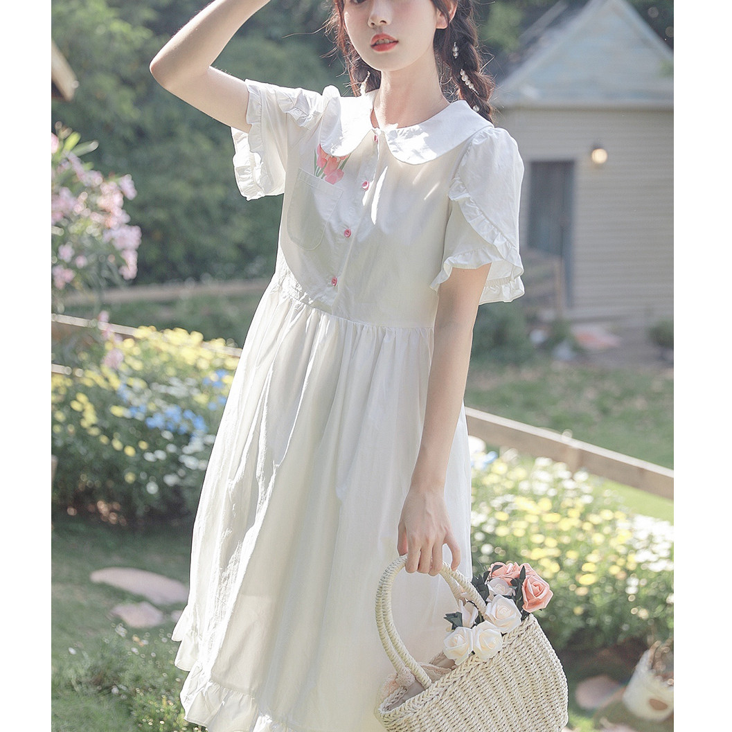韩系温柔学院风白色绣花短袖连衣裙女学生夏季POLO领收腰显瘦长裙