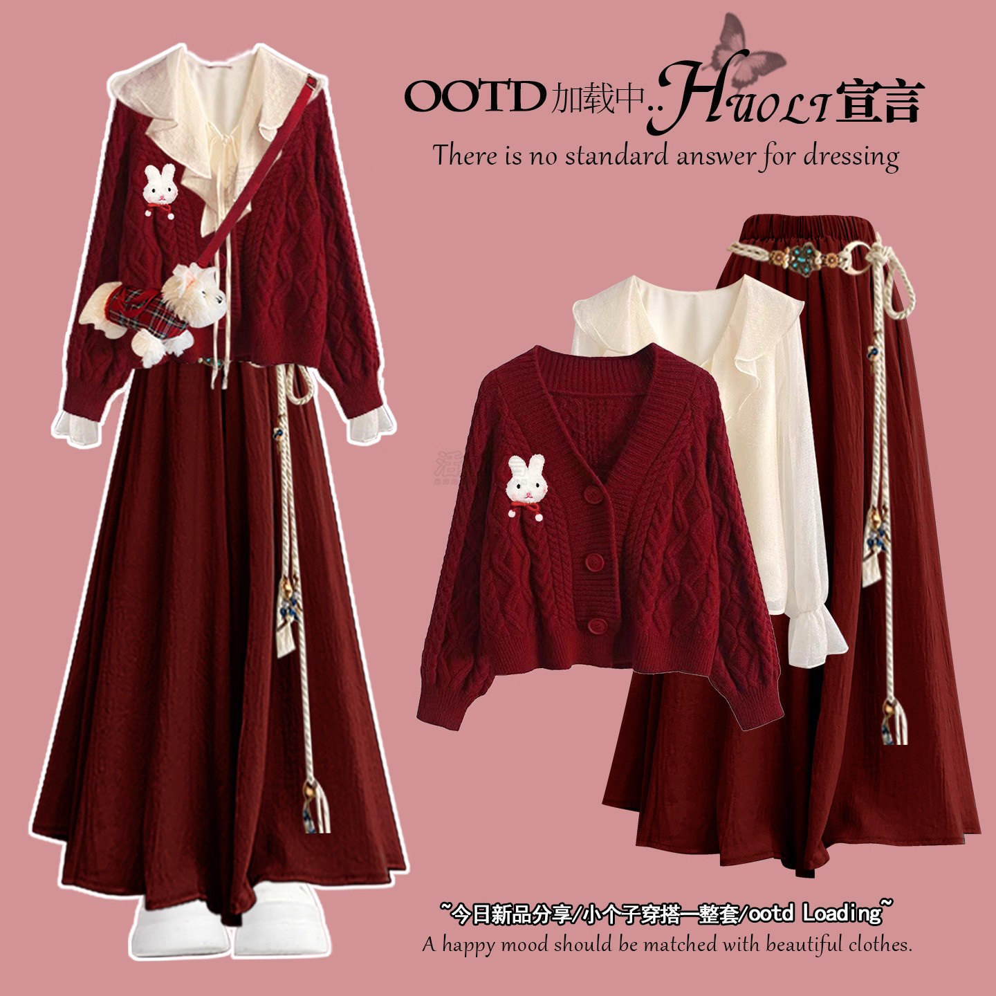圣诞服装穿搭千金感穿搭红色连衣裙女冬季2025新款巨好看的毛衣裙