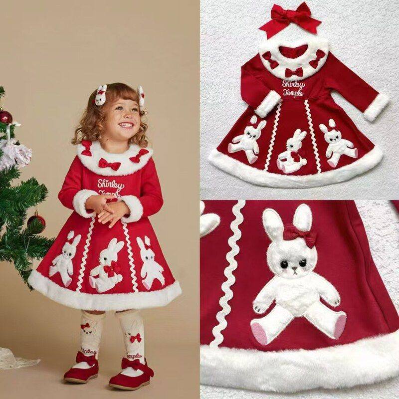 现货ST日系贵牌女童儿童装小兔子红色长袖连衣裙毛绒圣诞服装秋冬