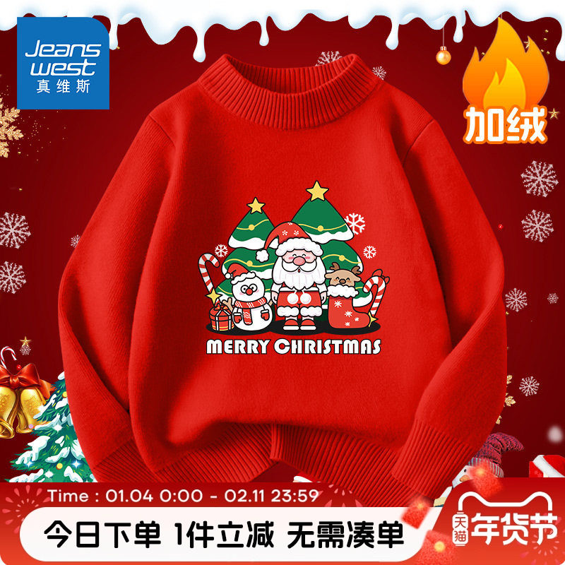 真维斯童装女童加绒毛衣2026新款男童红色针织衫上衣儿童圣诞服装