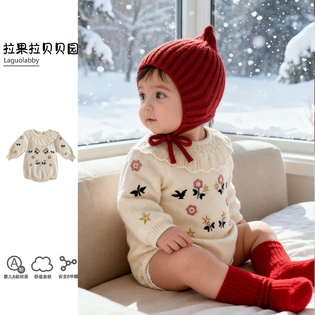 拉果拉宝宝加绒保暖针织毛衣包屁衣圣诞服装小月龄宝宝毛线衣套装