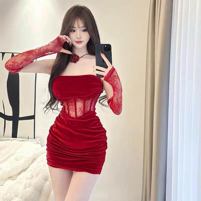 欲见*圣诞服装红丝绒连衣裙高级感性感蕾丝拼接掐腰显瘦女包臀裙