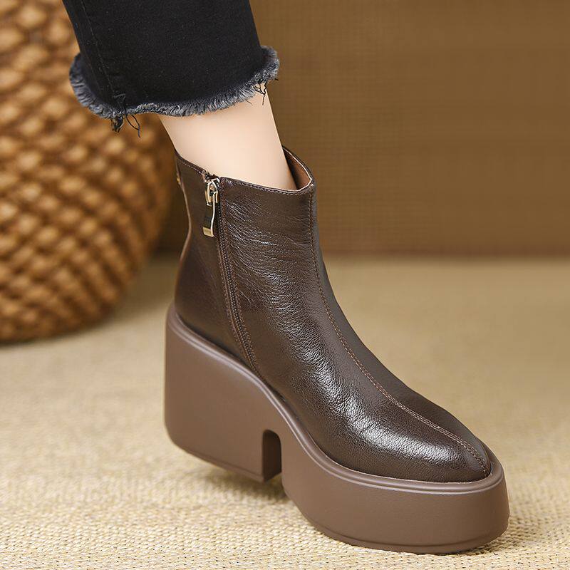 2025秋冬棕色英伦复古真皮厚底防水台粗跟马丁靴女软皮高跟短靴女