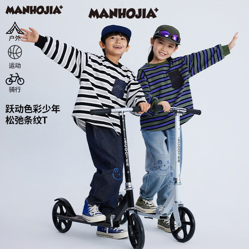 漫画家【跃动条纹】儿童T恤春秋条纹宽松男女中大童打底长袖卫衣T