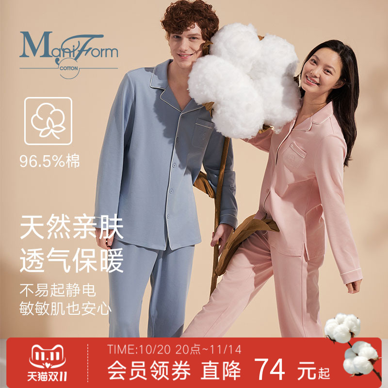 曼妮芬棉质生活秋季睡衣女可外穿长袖长裤男士睡衣套装情侣家居服