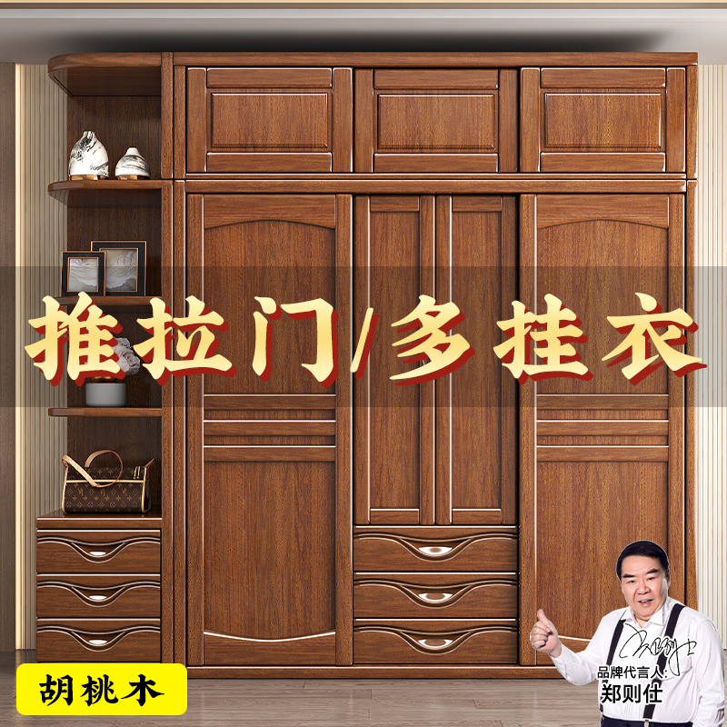 中式胡桃木实木衣柜家用卧室小户型推拉门衣橱大容量收纳储物柜子