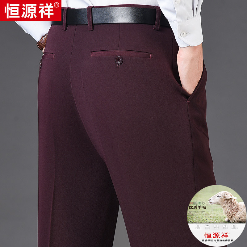 恒源祥羊毛西裤男秋冬厚款酒红中年男士商务宽松直筒爸爸西装裤子