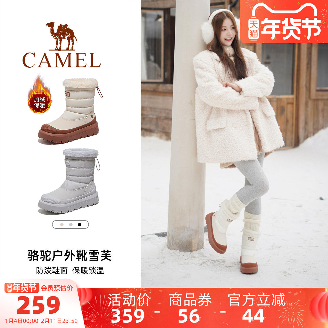 骆驼户外雪地靴女雪境防水防滑冬季东北加绒加厚靴子白色棉鞋短靴