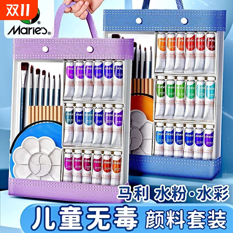 马利牌水粉颜料幼儿园儿童画画套装可水洗美术工具套装绘画手指画材料无毒白色水粉画12色24色玛丽水彩罐装