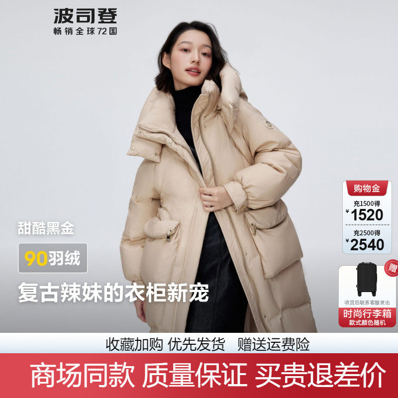 波司登2023女士鹅绒轻薄立领羽绒服宽松廓形中长款外套B30134162