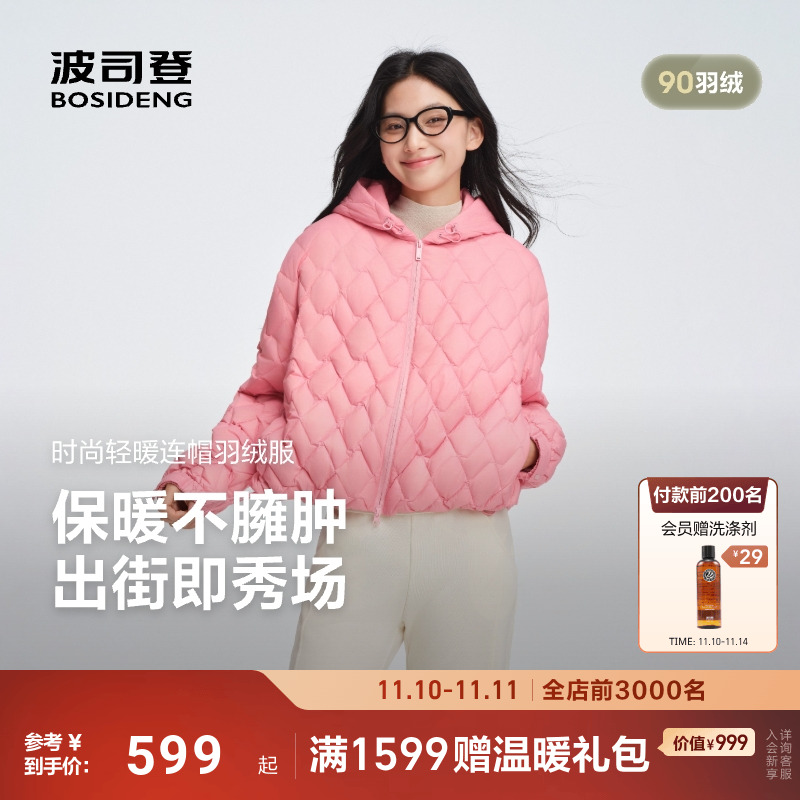 波司登2025新款女士宽松休闲菱形绗线连帽短款保暖轻薄羽绒服外套
