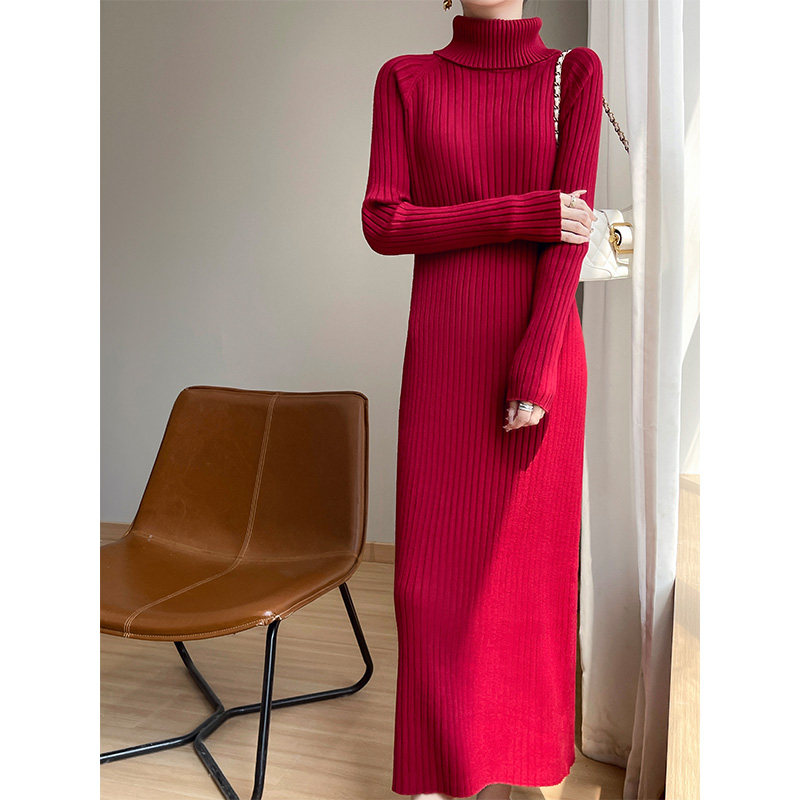 韩版简约舒适冬季加绒毛衣裙中长款过膝高领针织连衣裙配大衣内搭