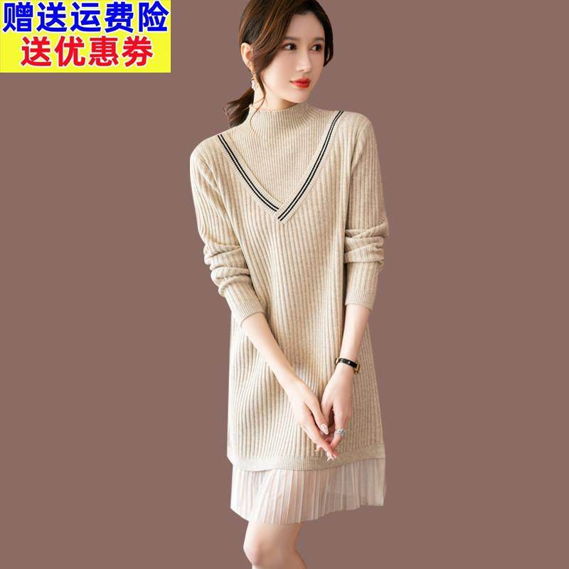 针织连衣裙女秋冬拼接网纱毛衣裙中长款洋气内搭羊毛打底衫羊绒衫