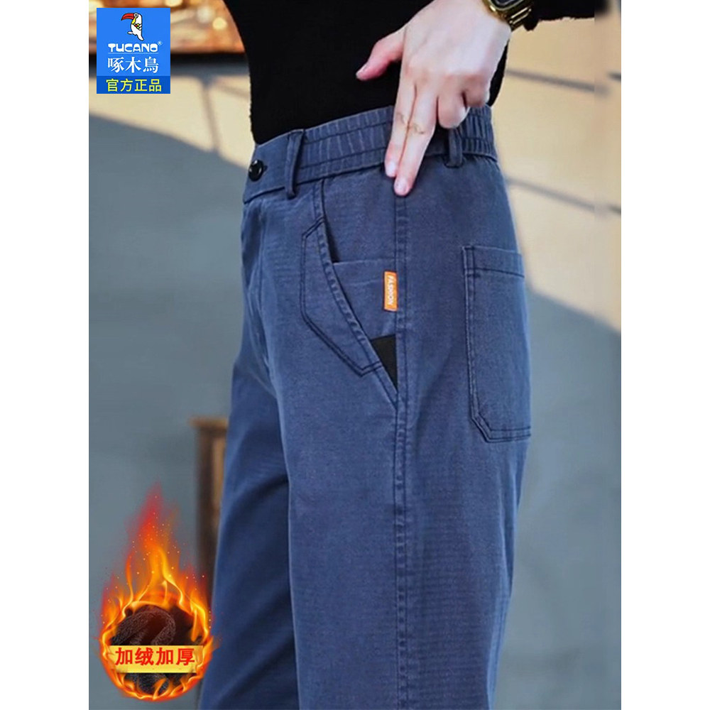 啄木鸟秋冬加绒加厚莱赛尔休闲裤男士弹力宽松直筒中老年潮流男裤